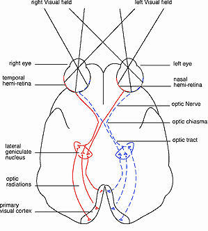 diagram 2) Pathways from the eyes to the visual cortext, viewed from below.