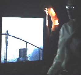 Abigail Child's "Best of Both Worlds" was a comparatively spare counterpoint to Naval's calculated barrage. She and her assistant dressed in white smocks and black crotch-harnessed belts, miming lab technicians or electricians, positioned - and repositioned - themselves both casually and deliberately to reflect the light of TV monitors and to catch the projection of a film that was reflected off a Mylar wall onto a white screen. Two TV monitors, in sync, were tuned manually by Child, and assistant Fernanda Affonseca, to broadcast programming. These were often left tuned to distorted and rolling images but would surface occasionally into a realizable broadcast image. A third much larger screen played back a crisp video of city winter skyscapes, of roofs, smoking furnace stacks, rhymed with clouds rolling in real time across the frame. It included sound and had both a passive and faintly sinister overtone [the storm approaches] though its references were largely to the quotidian and diurnal exterior world. The film projector ran a sex scene from a 1970s pornographic film in which a man describes being penetrated by a woman wearing a "strap-on" dildo. Near the end of the piece we hear him state: "...It was like having the best of both worlds..." A third musical source played a minimal rapid-beat of synthesized music. The issues raised in the performance, inspired by the Exoptic Theme, include: the narrative force of the body; the body as obstacle and desire; ideas of INTERFERENCE; the competing textures of the mediated visual world as techno fuzz, window, and/or deflected projection [the reflected screen]; the contrast of attention between the exterior and the interior, between the 'real' and the mediated, between what can be 'tuned' and what continues despite human ' interference.' All this with a crackling ironic humor bubbling underneath.