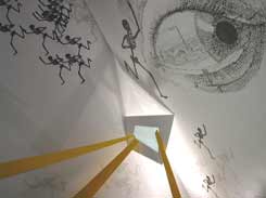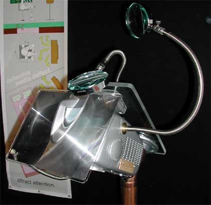 The "exoptitron" playing "exoptic fields," by mal, includes moveable magnifying lenses that invite manipulation and focus. Visitors responded by moving the lenses. Banners in the installation made the piece's central intention explicit: to consider deflection as a media objective as opposed to "attraction."