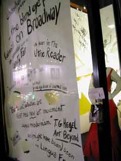 Other work included Steven Katz' 15-foot sculpture, "peer"; Bob Gill's design for the "exoptic fields" video box, installed by willy mal; a storefront window by Nathalie Adamidi and willy mal; a video loop of Benton Bainbridge and Naval Cassidy speaking on a Canadian TV program describing "deflective" media and the "blind eye projects."