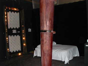 Bainbridge's "blind heat" installation included a bed. The bed's sheets served to reflect projected video from above, and a subwoffer underneath the bed broadcast the video soundtrack. His piece considered the idea of exciting physical passions while deflecting the direct viewer-attention. Visitors sat on the bed, felt the woofer kick and touched the video-flickered sheets.